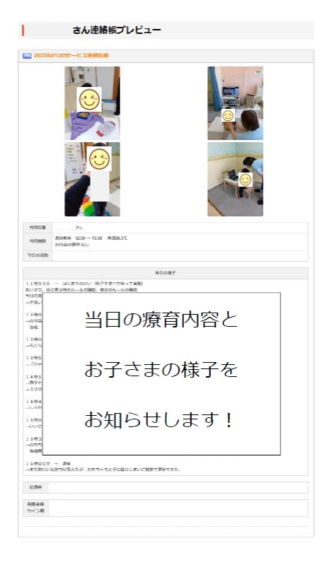 保護者さまは、お仕事等でなかなか見学できず、お子さまがどういった療育を受けているのか?