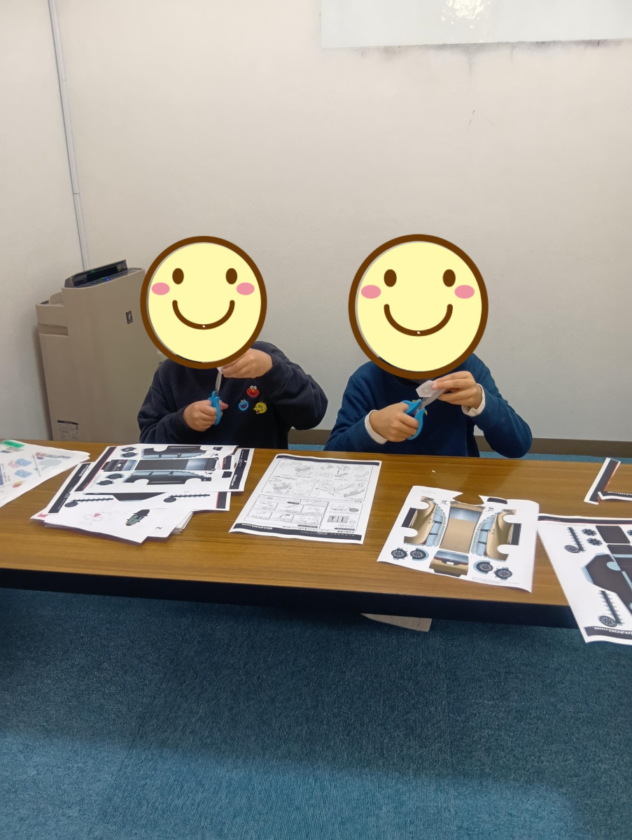 子どもたちが大好きな電車や車のペーパークラフトを沢山用意してあり、簡単なものから難しいものまで。お子さまは、その中から作りたいものを選びます。