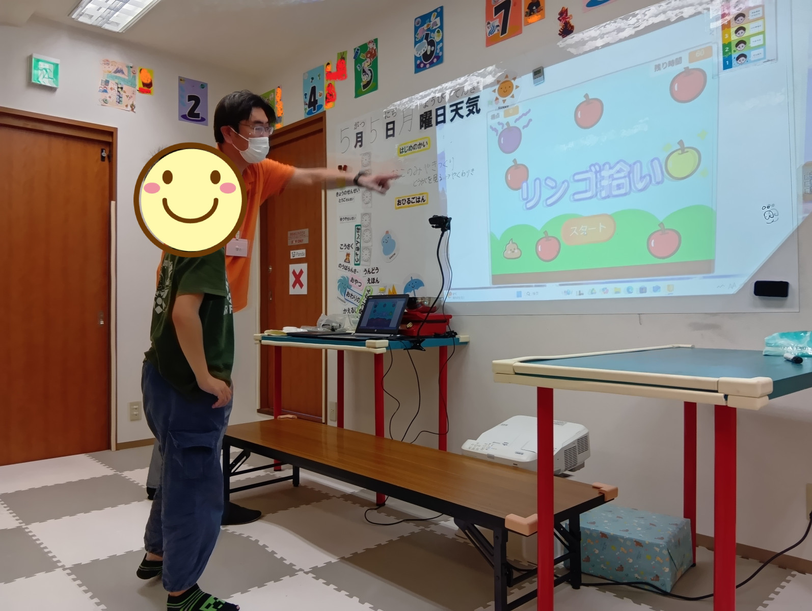 写真は、カメラを使ってお子さまを投影し、上から落ちてくるリンゴをキャッチするゲームです。