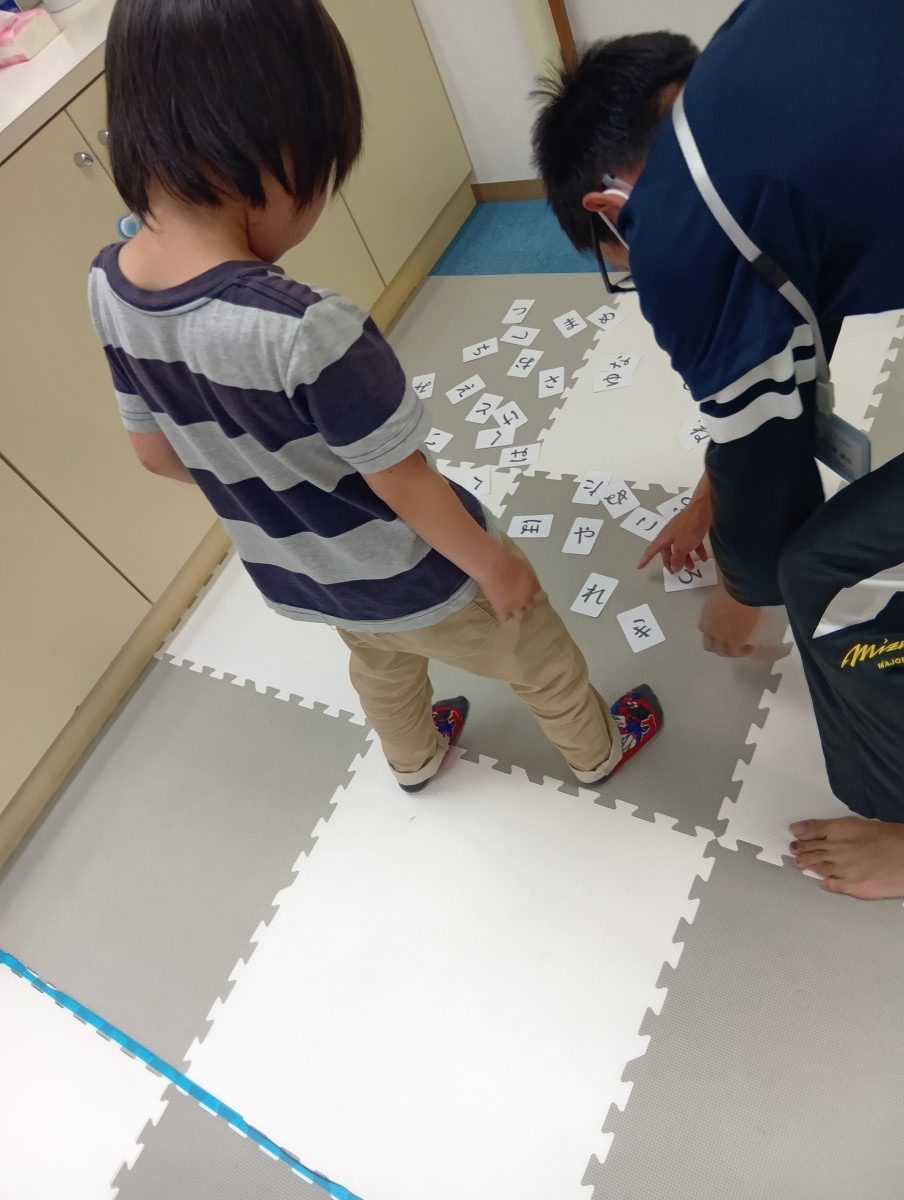 バラバラになった「ひらがなのカード」を床に置いて、